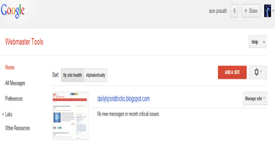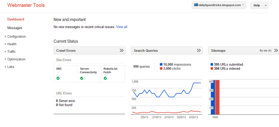 Clicking into this website will bring up a dashboard and a menu of all the different areas of webmaster tools. You can see some high-level information here around crawler errors and search queries.